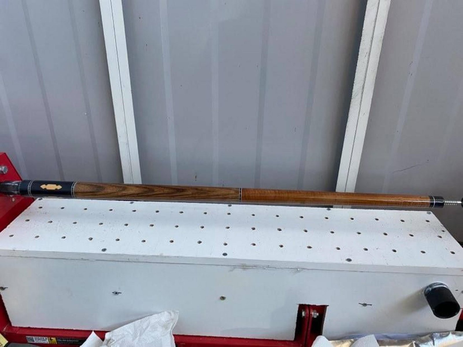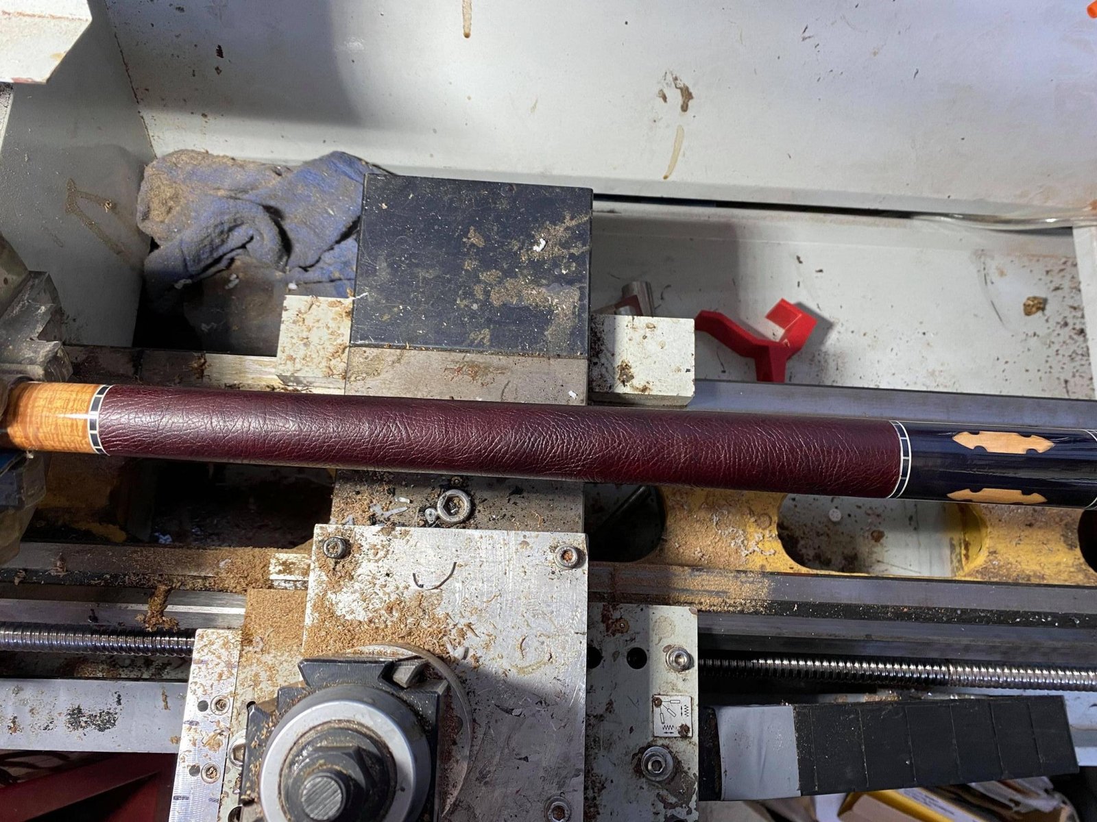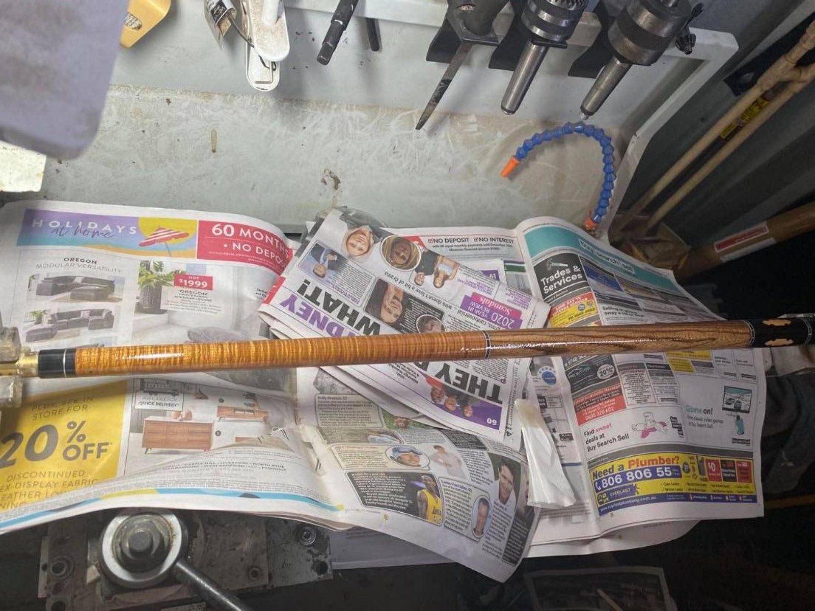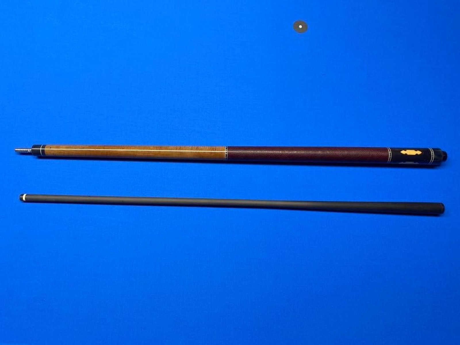 This is a 30" (760mm) playing cue with Zebrawood handle, Roasted Curly Maple forearm and Ebony butt sleeve with Huon Pine spearpoint inlays.