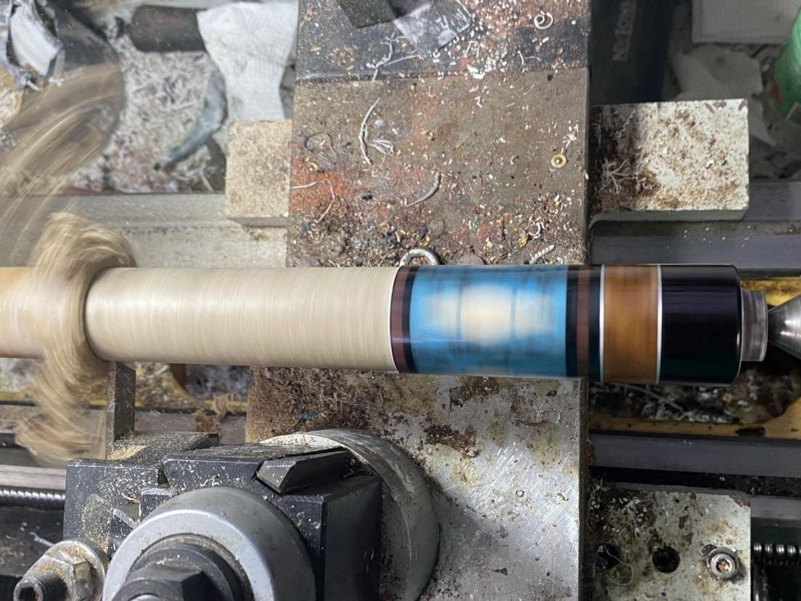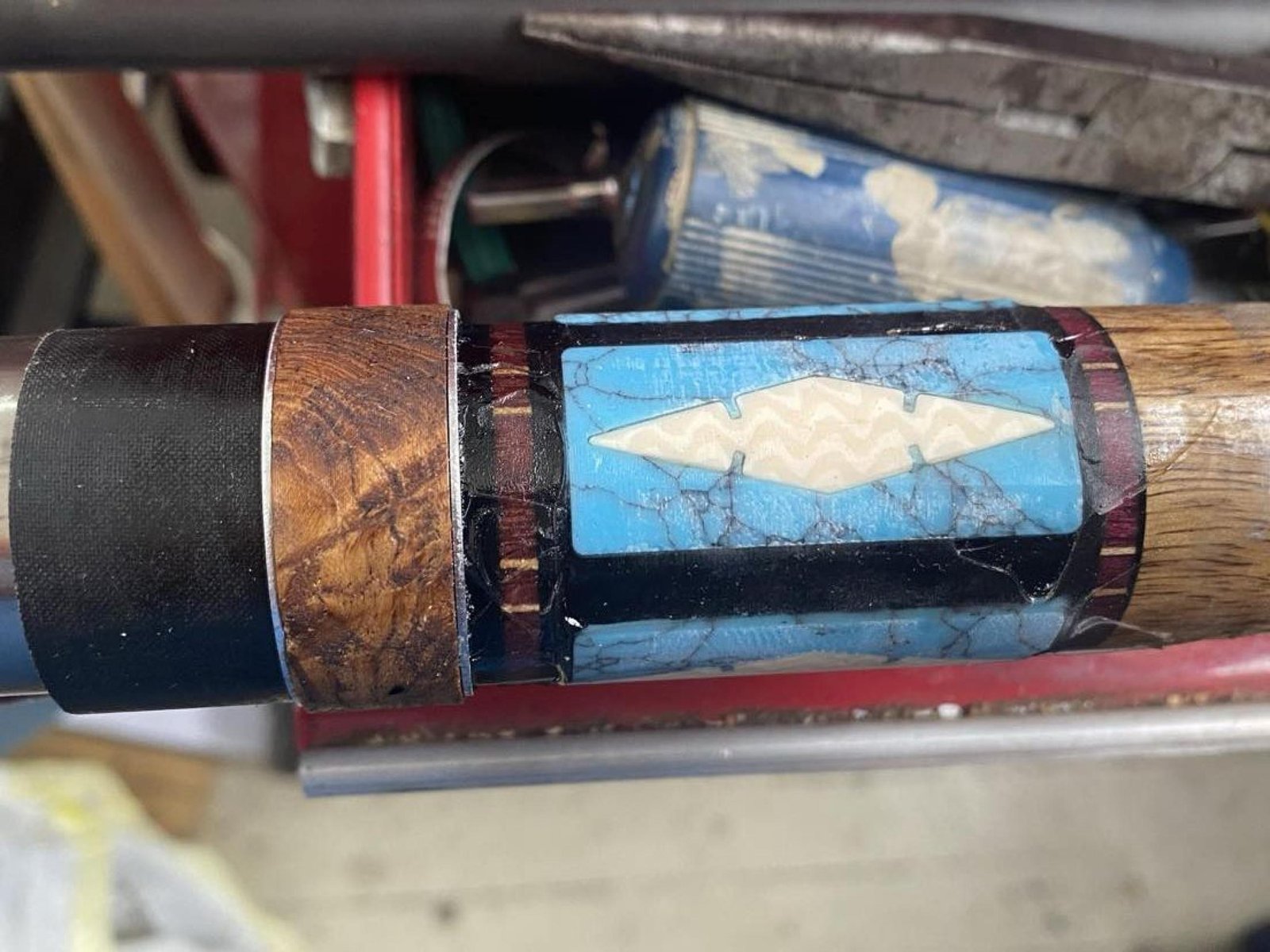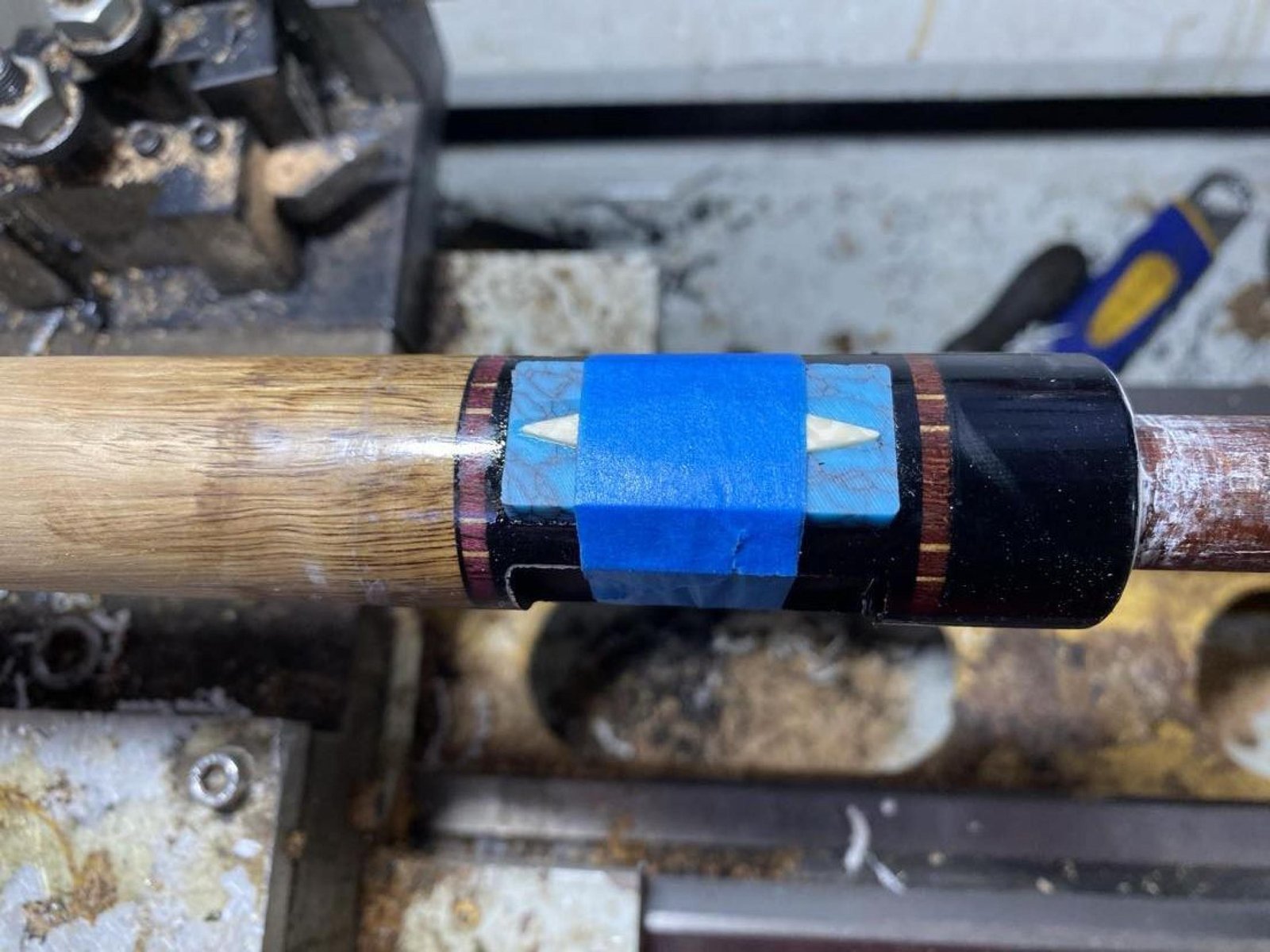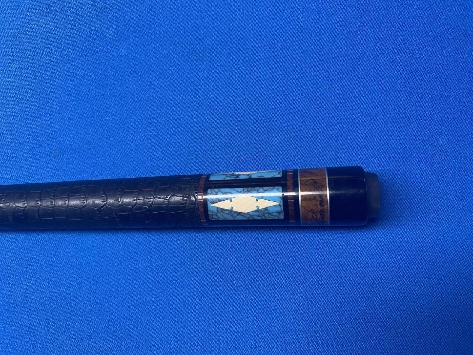 Handle is Jarrah and butt sleeve is Ebony with windows and inlays.