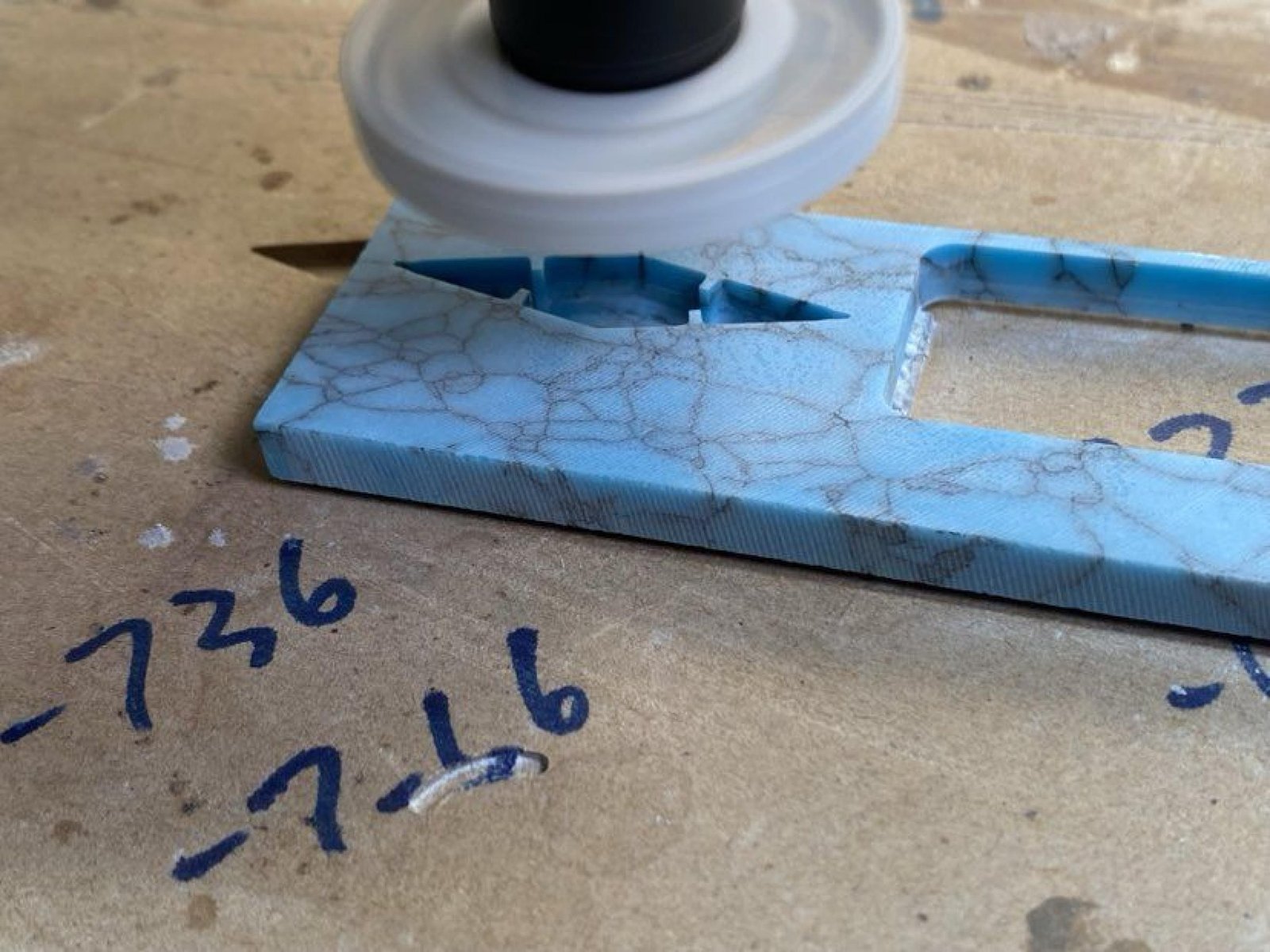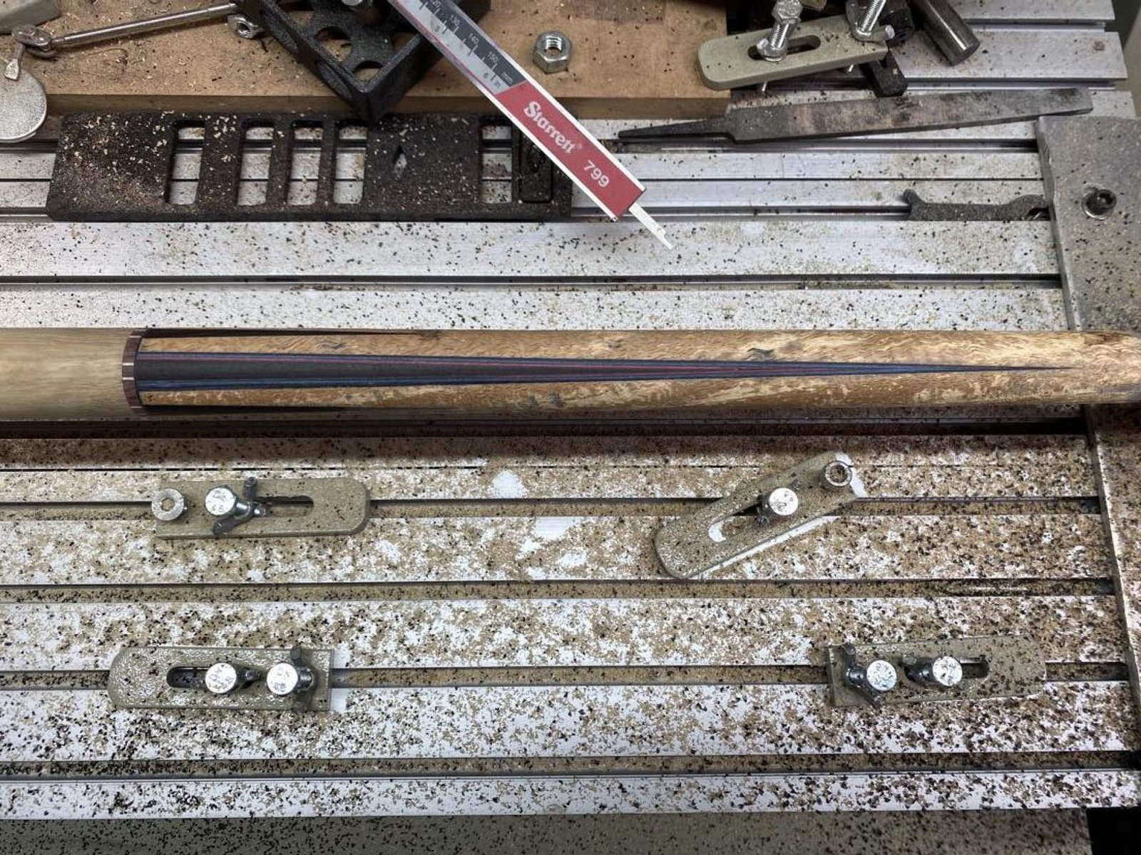 This is a cue with multi-coloured veneers with ebony points into a Mango wood forearm.
